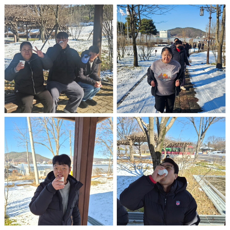 이번 드라이브의 목적지는 유관순 열사 기념관이었습니다. 차분한 분위기 속에서 잠시 발걸음을 멈추고 주변을 둘러보며, 겨울의 공기와 고요함을 천천히 즐겼습니다. 버스에서 내려 살짝 차가워진 몸을 녹여준 것은 바로 센터에서 정성껏 준비한 배생강차였습니다. 배, 생강, 계피, 대추를 넣어 끓인 따뜻한 차 한 잔은 손과 마음까지 포근하게 만들어 주었습니다.